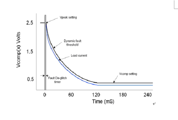 白熾燈的發(fā)光照明要求有一個動態(tài)故障閾值來對高浪涌電流進(jìn)行補償,并防止在開啟之初錯誤地觸發(fā)過電流條件。一個帶有開關(guān)的 RC 網(wǎng)絡(luò)的使用可以設(shè)置該動態(tài)故障的閾值(參見圖1)。通過使用這種方法,可以針對不同的白熾燈泡對短路電流進(jìn)行優(yōu)化。在最初的過電流閾值被設(shè)置時設(shè)置 VPEAK 電壓,然后當(dāng)在 VCOMP 終端上設(shè)置的電阻器分壓器值為恒定不變的 RC 時間常數(shù)時進(jìn)行衰減。每當(dāng)柵極從“關(guān)閉”狀態(tài)轉(zhuǎn)到“開啟”狀態(tài)時,便通過一個適當(dāng)通道的并行或串行輸入比特產(chǎn)生這種可變過電流閾值的波形。