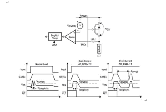 當(dāng)檢測到一個過電流狀態(tài)時,通過“關(guān)閉”器件或激活將以低占空比自動重試和 “開啟”FET 的選項設(shè)置,就可以對 FET 進(jìn)行保護(hù)。這樣就允許系統(tǒng)不斷地檢查故障是否已經(jīng)被排除,并且不會破壞 FET。圖3顯示了這種過電流檢測保護(hù)的原理圖。