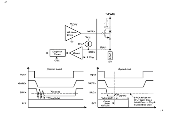 在“關(guān)閉”狀態(tài)下監(jiān)控開路負(fù)載故障為系統(tǒng)提供了負(fù)載完整性信息。當(dāng)開關(guān)完全處于“關(guān)閉”狀態(tài)下時,通過監(jiān)控外部功率 FET 的電源電壓,就可以實現(xiàn)對每一條通道開路負(fù)載故障的檢測。一個內(nèi)部電源激活一個流經(jīng)負(fù)載到接地的小恒定電流,并且使開路負(fù)載檢測閾值以下的 SRCx 節(jié)點發(fā)生偏置。