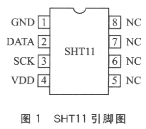 溫濕度傳感器SHTll集溫度傳感器和濕度傳感器于一體,因此采用SHTll進行溫濕度實時監(jiān)測的系統(tǒng)具有精度高、成本低、體積小、接口簡單等優(yōu)點;另外SHTll芯片內(nèi)部集成了14位A/D轉(zhuǎn)換器,且采用數(shù)字信號輸出,因此抗干擾能力也比同類芯片高。該芯片在溫濕度監(jiān)測、自動控制等領(lǐng)域均已得到廣泛應(yīng)用。