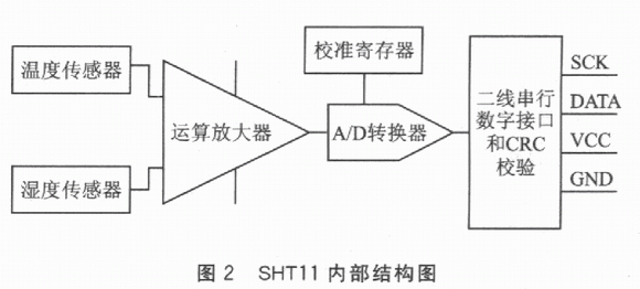 溫濕度傳感器SHTl1將溫度感測、濕度感測、信號變換、A/D轉(zhuǎn)換和加熱器等功能集成到一個芯片上,其內(nèi)部結(jié)構(gòu)如圖2所示。該芯片包括一個電容性聚合體濕度敏感元件和一個用能隙材料制成的溫度敏感元件。這兩個敏感元件分別將濕度和溫度轉(zhuǎn)換成電信號,該電信號首先進入微弱信號放大器進行放大;然后進入一個14位的A/D轉(zhuǎn)換器;最后經(jīng)過二線串行數(shù)字接口輸出數(shù)字信號。SHT11在出廠前,都會在恒濕或恒溫環(huán)境中進行校準,校準系數(shù)存儲在校準寄存器中;在測量過程中,校準系數(shù)會自動校準來自傳感器的信號,此外,SHT11內(nèi)部還集成了一個加熱元件,加熱元件接通后可以將SHTll的溫度升高5℃左右,同時功耗也會有所增加。此功能主要為了比較加熱前后的溫度和濕度值,可以綜合驗證兩個傳感器元件的性能。在高濕(>95%RH)環(huán)境中,加熱傳感器可預(yù)防傳感器結(jié)露,同時縮短響應(yīng)時間,提高精度。加熱后SHTll溫度升高、相對濕度降低,較加熱前,測量值會略有差異。