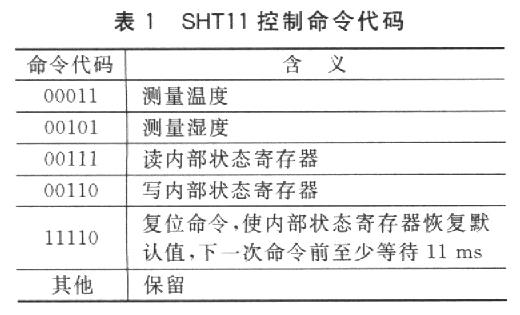 微處理器是通過二線串行數(shù)字接口與SHTl1進行通信的。通信協(xié)議與通用的I2C總線協(xié)議是不兼容的,因此需要用通用微處理器I/O口模擬該通信時序。微處理器對SHTll的控制是通過5個5位命令代碼來實現(xiàn)的,命令代碼的含義如表1所列。
