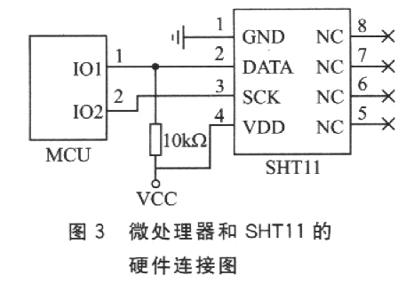 SHTl1通過二線數(shù)字串行接口來訪問,所以硬件接口電路非常簡單。需要注意的地方是:DATA數(shù)據(jù)線需要外接上拉電阻,時鐘線SCK用于微處理器和SHTll之間通信同步,由于接口包含了完全靜態(tài)邏輯,所以對SCK最低頻率沒有要求;當工作電壓高于4.5V時,SCK頻率最高為10 MHz,而當工作電壓低于4.5 V時,SCK最高頻率則為1 MHz。硬件連接如圖3所示。