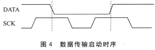 微處理器和溫濕度傳感器通信采用串行二線接口SCK和DATA,其中SCK為時鐘線,DATA為數(shù)據(jù)線。該二線串行通信協(xié)議和I2C協(xié)議是不兼容的。在程序開始,微處理器需要用一組“啟動傳輸”時序表示數(shù)據(jù)傳輸?shù)膯?,如圖4所示。當SCK時鐘為高電平時,DATA翻轉(zhuǎn)為低電平;緊接著SCK變?yōu)榈碗娖?,隨后又變?yōu)楦唠娖?在SCK時鐘為高電平時,DATA再次翻轉(zhuǎn)為高電平。