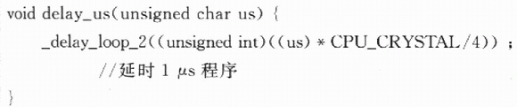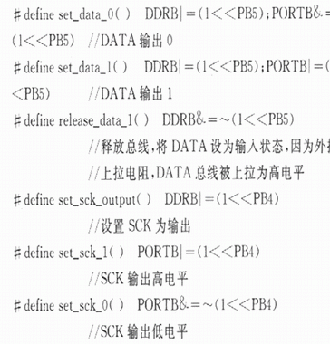 通過以上宏定義,可以實現(xiàn)SCK和DATA總線的各種輸入和輸出狀態(tài)。為了模擬該二線串行數(shù)字協(xié)議,還需要一個延時函數(shù)。WINAVR庫函數(shù)提供了一個延時函數(shù)_delay_loop_2(unslgned char s),該延時函數(shù)運行用4個時鐘周期,所以白定義延時1μs函數(shù)可以定義如下:#deftne CPU_CRYSTAL 7.3728