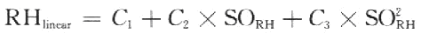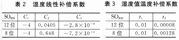 式中:RHincar為經(jīng)過線性補償后的濕度值,SORH為相對濕度測量值,C1、C2、C3為線性補償系數(shù),取值如表2所列。