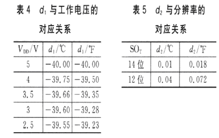 式中:d1和d2為特定系數(shù),d1的取值與SHTll工作電壓有關(guān),d2的取值則與SHTll內(nèi)部A/D轉(zhuǎn)換器采用的分辨率有關(guān),其對應(yīng)關(guān)系分別如表4和表5所列。