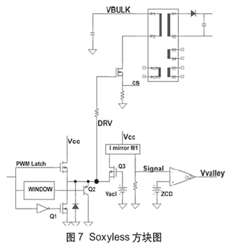 Soxyless模塊的主要功能為:啟動PNP;禁用推挽驅(qū)動器的下部NFET;在漏極電壓振蕩的負(fù)dV/dt部分在驅(qū)動器輸出DRV上形成“虛擬地”;捕獲(流出DRV輸出端的)負(fù)電流;檢測“正向ZCD DRV電流”。
