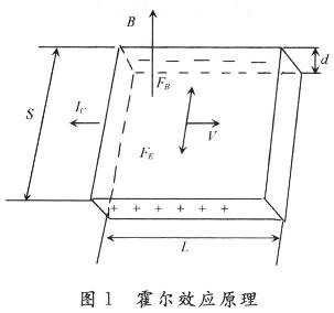 如圖1所示,一個N型半導(dǎo)體薄片,長度為L,寬度為S,厚度為d,在垂直于該半導(dǎo)體薄片平面的方向上,施加磁感應(yīng)強度為B的磁場,若在長度方向通以電流Ic則運動電荷受到洛倫茲力的作用,正負電荷將分別沿垂直于磁場和電流的方向向?qū)w兩端移動,并聚集在導(dǎo)體兩端形成一個穩(wěn)定的電動勢UH,這就是霍爾電動勢(或稱之為霍爾電壓),這種現(xiàn)象稱為霍爾效應(yīng)?;魻栯妷旱拇笮H=RIB/d=KHICB,其中R為霍爾常數(shù);KH為霍爾元件的乘積靈敏度。