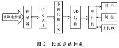檢測系統(tǒng)構(gòu)成如圖2,被測量經(jīng)霍爾傳感器轉(zhuǎn)換為電壓信號,經(jīng)信號調(diào)理電路和多路轉(zhuǎn)換開關(guān)選擇,通過A/D轉(zhuǎn)換器送給單片機,單片機采用89C51,是該系統(tǒng)的主控器,鍵盤選用2×4鍵盤,用于選擇被測量的種類,采用數(shù)碼管或液晶顯示被測量的大小。