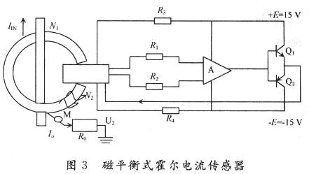 電流的測量可采用磁平衡式霍爾電流傳感器(亦稱為零磁通式霍爾傳感器)如圖3所示。
