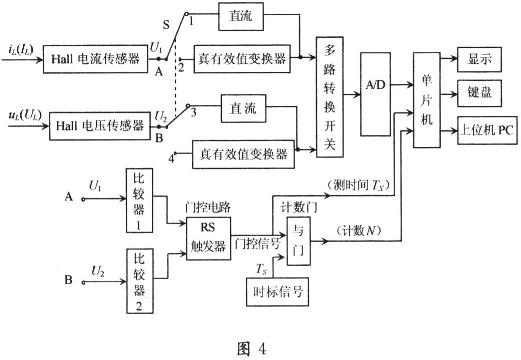 由正弦交流電有功功率的定義P=UIcosψ可知,只要準(zhǔn)確測量出U,I及電流與電壓相位差ψ,就可算出P與cosψ。采用傳統(tǒng)的電磁式電壓、電流互感器進行測量,由于互感器的非理想性,除存在變比誤差外,更主要的是存在較大的相位誤差,這就使測得的ψ值不能真實地反映負載的性質(zhì)。若采用霍爾電壓、電流傳感器及真有效值轉(zhuǎn)換器(如AD637)等,可以使功率及功率因數(shù)的測量精度大大提高。
