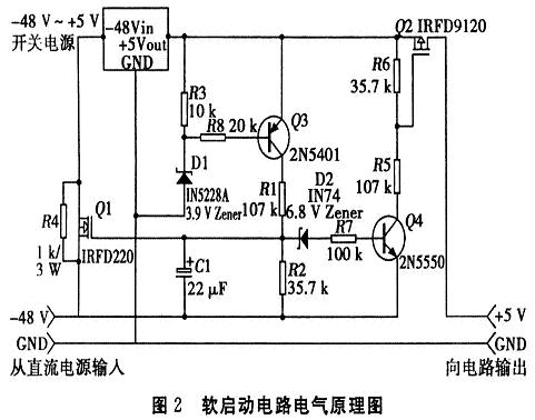 下面采用一個(gè)從-48V~+5V的開(kāi)關(guān)電源路論述“軟啟動(dòng)”技術(shù)。所用的開(kāi)關(guān)電源是一個(gè)含有LT1172HVCT的穩(wěn)壓器,從負(fù)到正補(bǔ)償提升式(buck-boost)轉(zhuǎn)換器,其實(shí)任何一個(gè)從-48V~+5V的開(kāi)關(guān)電源都能工作。其中,軟啟動(dòng)電路和開(kāi)關(guān)電源電路是相互獨(dú)立的,電氣原理如圖2所示。