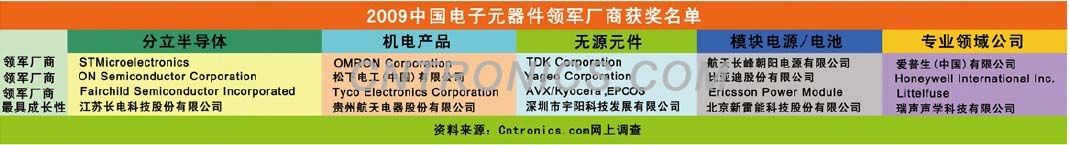 2009中國市場電子元器件領(lǐng)軍廠商評(píng)選活動(dòng)隆重亮相,在社區(qū)網(wǎng)友的積極參與下,經(jīng)過激烈的網(wǎng)上投票和打分,令人翹首期盼的獲獎(jiǎng)名單終于震撼登場,共有16家中外企業(yè)最終獲得“2009中國市場電子元器件領(lǐng)軍廠商”稱號(hào),另有五家本土企業(yè)分獲“2009中國市場電子元器件最具成長性公司”稱號(hào)。