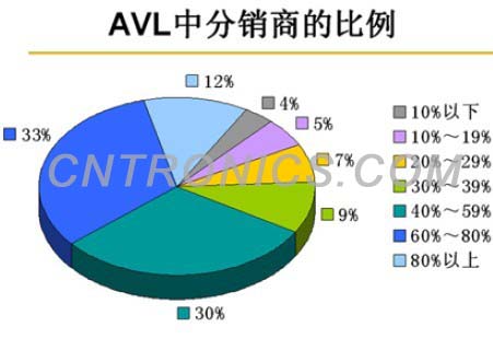 在合格供應(yīng)商清單(AVL,Approved Vendor List)中,有超過1/3的電子整機(jī)廠商的AVL中分銷商比例超過六成,1/3的整機(jī)廠商的AVL中分銷商占據(jù)半壁江山。總體有超過2/3的整機(jī)廠商中有一半的產(chǎn)品供應(yīng)來自分銷商??梢姺咒N商在電子元器件供應(yīng)鏈中扮演重要角色。