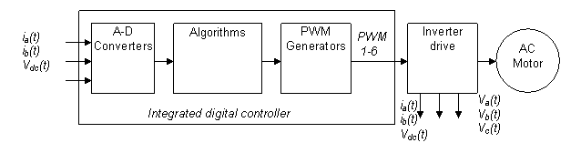 圖 1 是通用數(shù)字馬達(dá)控制系統(tǒng)的結(jié)構(gòu)簡圖。算法可在數(shù)字控制器上實施,數(shù)字控制器生成的控制輸出可通過逆變器驅(qū)動馬達(dá)。電流及電壓測量等反饋信號通過模數(shù)轉(zhuǎn)換器 (ADC) 反饋至該算法。