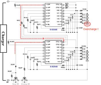 下面,詳細(xì)介紹一下保護(hù)芯片級聯(lián)的具體工作情況。還是以S-8204B為例,其CTLC端子可由芯片外部控制COP端子的輸出電壓、而CTLD端子則可由芯片外部控制DOP端子的輸出電壓。通過CTLC端子以及CTLD端子可以分別單獨(dú)控制COP端子與DOP端子的輸出電壓。并且,這些控制功能優(yōu)先于芯片內(nèi)部的電池充放電保護(hù)功能。如果8節(jié)電池中的某一節(jié)電池發(fā)生過充,與該電池相連接的S-8204B的COP端子輸出電壓會發(fā)生變化,該電壓變化會傳遞到與其相連接的另一個S-8204B的CTLC端子,使得另一個S-8204B的COP端子輸出電壓也發(fā)生變化,從而控制充電控制用MOSFET關(guān)斷,實現(xiàn)鋰離子電池的過充電保護(hù)。