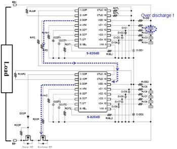 如果8節(jié)電池中的某一節(jié)電池發(fā)生過放電時,則由與該電池相連接的S-8204B的DOP端子向另一個S-8204B芯片的CTLD端子發(fā)出過放信號,改變其DOP端子的狀態(tài),最終使得放電控制用MOSFET關(guān)斷,結(jié)束放電。圖2給出了采用兩個S-8204B實現(xiàn)過充電保護(hù)的電路工作原理圖(在N溝道MOSFET控制情況下),圖3是過放電保護(hù)工作原理圖。