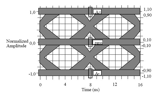 本次測試將主要驗(yàn)證產(chǎn)品上4個以太網(wǎng)100Base-TX接口的技術(shù)指標(biāo)。對于其中比較直觀的100Base-TX物理層的眼圖模板,《ANSI+X3_263-1995》標(biāo)準(zhǔn)中有著明確的眼圖模板定義見圖2。
