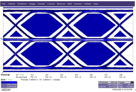關(guān)于100Base-TX接口技術(shù)指標(biāo)的測試方法,《IEEE Std 802.3-2000》標(biāo)準(zhǔn)中也有詳細(xì)的說明, 工程師按照誘導(dǎo)發(fā)包的測試方法進(jìn)行了網(wǎng)口眼圖的測試,測試過程中發(fā)現(xiàn)測試網(wǎng)口出現(xiàn)了信號波形碰觸模板的問題,波形見圖3: