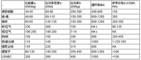 注:NA-數(shù)據(jù)不詳、a-C/3放電率、b-80%DOD、c-機(jī)械重充電、d-僅供參考、USABC-美國(guó)先進(jìn)蓄電池協(xié)作體。