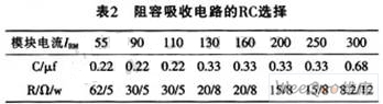 模塊過(guò)壓保護(hù)一般也可采用阻容吸收法。對(duì)于持續(xù)時(shí)間較短,能量不大的過(guò)電壓,一般可在模塊兩端并聯(lián)阻容吸收電路,用吸收電容把過(guò)電壓的電磁能量變成靜電能量存貯起來(lái)。而用吸收電阻不但可以防止電路振蕩,還可限制晶閘管導(dǎo)通時(shí)電容放電所產(chǎn)生的開通損耗和di/dt值。并聯(lián)在晶閘管開關(guān)模塊的RC值可參考表2。