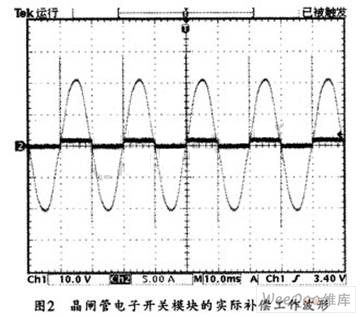 在無(wú)功補(bǔ)償實(shí)際應(yīng)用中,可將晶閘管電子開關(guān)模塊用在TSC低壓無(wú)功補(bǔ)償以替代接觸器,這樣,就可以在開關(guān)電壓過(guò)零時(shí)投入補(bǔ)償電容量,從而避免了沖擊電流的產(chǎn)生和瞬間電網(wǎng)電壓的波動(dòng)。圖2所示是其工作波形圖。