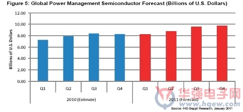 2011年的其它趨勢包括,電源IC集成度進一步提高;擁有進一步集成其芯片的技術(shù)的供應(yīng)商,將在銷售收入方面獲益最多。