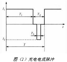 快速充電器根據(jù)實(shí)時(shí)檢測到的電池組的端電壓、充電電流、溫度、動(dòng)態(tài)內(nèi)阻等信息,按照馬斯充電定律,通過采用智能控制算法實(shí)施對充電電流脈沖寬度T1、間歇時(shí)間T2、放電電流脈沖T3的分段調(diào)節(jié),以消除被充電電池組的電極化現(xiàn)象,使電池組時(shí)刻處于較佳的電流接受狀態(tài),提高充電速度和充電效率。具體控制過程是,首先用較寬的充電脈沖進(jìn)行充電,蓄電池的端電壓上升,當(dāng)?shù)竭_(dá)充電時(shí)間T1時(shí),充電器暫停充電,當(dāng)充電間歇時(shí)間達(dá)到T2時(shí)充電器繼續(xù)充電,如此反復(fù),如圖(2)所示。