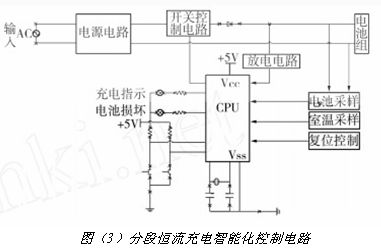 分段恒流充電智能化控制電路如圖(3)所示。該電路采用 CPU 控制,可對充電電池和充電環(huán)境溫度進(jìn)行檢測,對電池充電進(jìn)行計(jì)時(shí),采用充電過程中電池的電壓和電流,對分段恒流充電過程進(jìn)行控制。