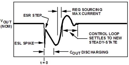 所有的電容都含有ESR和ESL,二者都會(huì)對(duì)瞬態(tài)響應(yīng)產(chǎn)生明顯的影響。在一個(gè)增加的電流負(fù)載瞬變過(guò)程中看到的輸出電壓與圖2中顯示的類(lèi)似。