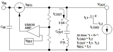 穩(wěn)壓器的電流源(IREG)不能立即發(fā)生變化,因此在“t = 0+”時(shí)刻(也就是負(fù)載電流增加到IL2的瞬間),IREG = IL1。通過(guò)簡(jiǎn)單節(jié)點(diǎn)分析得出,此時(shí)電流源需要輸出電容: