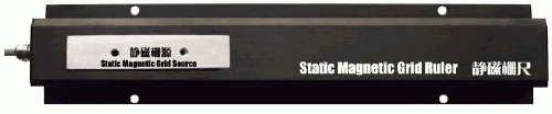 靜磁柵位移傳感器由“靜磁柵源”和“靜磁柵尺”兩部分結(jié)合使用。“靜磁柵源”使用鋁合金壓封無源釹鐵硼磁柵組成磁柵編碼陣列;“靜磁柵尺”用內(nèi)藏嵌入式微處理器系統(tǒng)的特制高強(qiáng)度鋁合金管材封裝,使用開關(guān)型霍爾傳感器件組成霍爾編碼陣列,鋁合金管材外部使用防氧化鍍塑處理。“靜磁柵源”沿“靜磁柵尺”軸線作無接觸(相對(duì)間隙寬容度和相對(duì)姿態(tài)寬容度達(dá)50mm)相對(duì)運(yùn)動(dòng)時(shí),由“靜磁柵尺”解析出數(shù)字化位移信息,直接產(chǎn)生高于毫米數(shù)量級(jí)的位移量數(shù)字信號(hào)。充分發(fā)掘嵌入式微處理器的資源,將數(shù)據(jù)更新速度提高到毫秒數(shù)量級(jí),以便能適應(yīng)5m/S以下運(yùn)動(dòng)速度的位移響應(yīng)。
