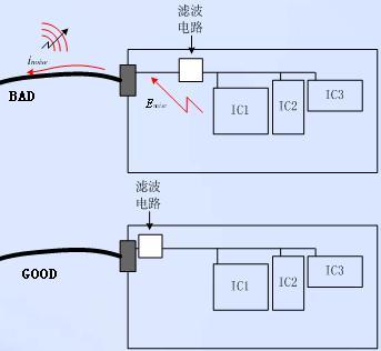 對(duì)于時(shí)鐘線、總線、射頻線等強(qiáng)輻射信號(hào)線和復(fù)位信號(hào)線、片選信號(hào)線、系統(tǒng)控制信號(hào)等敏感信號(hào)線,應(yīng)遠(yuǎn)離接口外出信號(hào)線。從而避免強(qiáng)輻射信號(hào)線上的干擾耦合到外出信號(hào)線上,向外輻射;也避免接口外出信號(hào)線帶進(jìn)來(lái)的外來(lái)干擾耦合到敏感信號(hào)線上,導(dǎo)致系統(tǒng)誤操作。