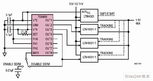 硅振蕩器為多相、擴(kuò)頻開(kāi)關(guān)穩(wěn)壓器時(shí)鐘提供了一個(gè)理想的平臺(tái)。除了具有一個(gè)板上時(shí)鐘發(fā)生器之外,這些固態(tài)器件還能將擴(kuò)頻調(diào)制與多相輸出組合起來(lái)??紤]到這一點(diǎn),凌力爾特公司開(kāi)發(fā)出了LTC6909(圖1),這是一款具有8個(gè)單獨(dú)多相輸出的精準(zhǔn)擴(kuò)頻硅振蕩器。單個(gè)電阻器負(fù)責(zé)在12.5kHz至 6.67MHz的范圍內(nèi)選擇輸出頻率。三個(gè)邏輯輸入用于設(shè)定輸出相位關(guān)系(范圍從45°至120°),從而允許LTC6909為多達(dá)8個(gè)相位提供同步??梢詥⒂靡环N偽隨機(jī)擴(kuò)頻調(diào)頻,頻率擴(kuò)展量在中心頻率的±10%。用戶可選擇3種調(diào)制速率之一,以確保調(diào)制速率不超過(guò)穩(wěn)壓器的帶寬。此外,LTC6909還具有一個(gè)創(chuàng)新的濾波器,該濾波器負(fù)責(zé)跟蹤SSFM調(diào)制速率并在頻率轉(zhuǎn)換之間提供平滑處理。