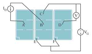 圖2顯示了測(cè)量的結(jié)構(gòu)。3個(gè)MOSFET和6個(gè)探針均在圖中顯示出來(lái),電接觸則示意性地畫(huà)出。中間的MOSFET是待測(cè)器件。
