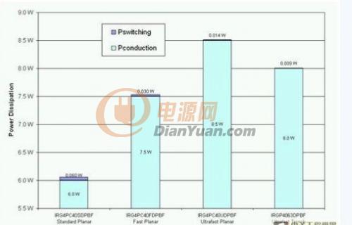 低壓側(cè)IGBT同樣有同一問(wèn)題。究竟哪一種IGBT才能提供最低的功耗?由于這些IGBT只會(huì)進(jìn)行 50Hz或60Hz切換,如圖5所示,標(biāo)準(zhǔn)速度IGBT可提供最低的功耗。雖然標(biāo)準(zhǔn)IGBT會(huì)帶來(lái)一些開(kāi)關(guān)損耗,但數(shù)值并不足以影響IGBT的總功耗。事實(shí)上,最新的槽柵IGBT仍然擁有較高的功耗,因?yàn)檫@一代的槽柵IGBT專(zhuān)門(mén)針對(duì)高頻率應(yīng)用而設(shè)計(jì),以平衡開(kāi)關(guān)和導(dǎo)通損耗為目標(biāo)。因此,對(duì)低壓側(cè)IGBT 來(lái)說(shuō),標(biāo)準(zhǔn)速度平面式IGBT仍然是必然選擇。