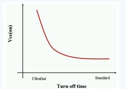 IGBT基本上是具備金屬門(mén)氧化物門(mén)結(jié)構(gòu)的雙極型晶體管 (BJT) 。這種設(shè)計(jì)讓IGBT的柵極可以像MOSFET一樣,以電壓代替電流來(lái)控制開(kāi)關(guān)。作為一種BJT,IGBT的電流處理能力比MOSFET更高。同時(shí),IGBT亦如BJT一樣是一種少數(shù)載體元件。這意味著 IGBT關(guān)閉的速度是由少數(shù)載體復(fù)合的速度快慢來(lái)決定。此外,IGBT的關(guān)閉時(shí)間與它的集極-射極飽和電壓 (Vce(on)) 成反比(如圖3所示)。