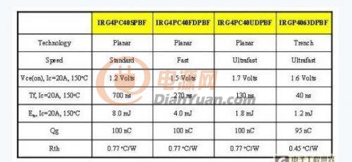 表1顯示了四個(gè)擁有相同尺寸的IGBT的參數(shù)值。前三個(gè)IGBT采用同樣的平面式技術(shù),但使用不同的壽命復(fù)合控制計(jì)量。從表中可見(jiàn),標(biāo)準(zhǔn)速度的IGBT具有最低Vce(on) ,但與快速和超速平面式IGBT相比,標(biāo)準(zhǔn)速度的IGBT下降時(shí)間最慢。第四個(gè)IGBT是經(jīng)優(yōu)化的槽柵IGBT,能夠?yàn)樘?yáng)能逆變器這類(lèi)高頻率切換應(yīng)用提供低導(dǎo)通和開(kāi)關(guān)損耗。請(qǐng)注意,槽柵IGBT的Vce(on) 和總切換損耗 (Ets) 比超速平面式IGBT低。