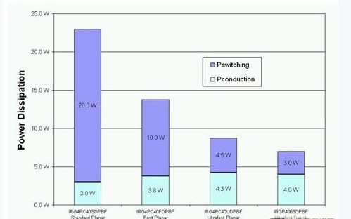 前文討論了高壓側(cè) IGBT在20kHz或以上頻率進(jìn)行切換。假設(shè)設(shè)計(jì)一個(gè)擁有230V交流輸出的1.5kW 太陽(yáng)能逆變器,表1中哪種IGBT具有最低的功耗呢?圖4顯示了IGBT在20kHz進(jìn)行切換的功耗分析,由此可見(jiàn)超速平面式IGBT比其它兩種平面式 IGBT具有更低的總功耗。