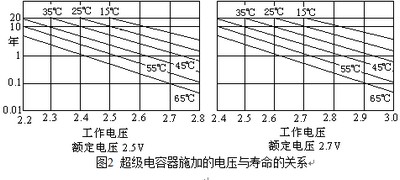 與鋁電解電容器不同,超級(jí)電容器施加電壓的壽命要比不施加電壓的壽命短。在額定電壓以下,超級(jí)電容器施加的電壓與超級(jí)電容器壽命的關(guān)系如圖2。