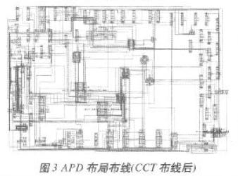 如上所述,MCM布局布線的實(shí)現(xiàn)包括電路原理圖生成、擴(kuò)充零件庫(kù)及最終的布局布線完成和加工數(shù)據(jù)文件輸出。APD Layout包括Padstack(*.pad)、Package Symbol(*.psm)、Mechanical Symbol(*.bsm)、Format Symbol (*.osm)和Shape Symbol(*.ssm)五種,MCM布局布線設(shè)計(jì)中,所有的布局都必須有正確的Library Packing。MCM設(shè)計(jì)軟件自帶封裝庫(kù)往往不能滿足具體設(shè)計(jì)要求,只有擴(kuò)充零件庫(kù)后,才能直接調(diào)用零件進(jìn)行布局布線設(shè)計(jì)及最終的工藝文件輸出。首先利用Padstack Editor軟件擴(kuò)充零件庫(kù),然后對(duì)電路進(jìn)行封裝,并通過(guò)Concept HDL給APD軟件導(dǎo)出電連接網(wǎng)表文件,最后完成電路布局布線。以檢測(cè)器電路為例,其原理圖主要部分如圖2所示,圖3為CCT(Spectra)布線后的形式。整個(gè)設(shè)計(jì)中,定義了16個(gè)Padstack和81個(gè)封裝符號(hào),進(jìn)行251次調(diào)用Padstack和89次調(diào)用功能單元,其中共用到了251個(gè)元件封裝符號(hào)引腳和229個(gè)功能單元引腳。
