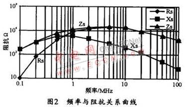 EMI 濾波器需要抑制的頻率范圍通常在10kHz~50 MHz之間。為了使共模濾波電路在此頻率范圍內(nèi)都能提供適當(dāng)?shù)乃p,磁芯在此頻率范圍內(nèi)的阻抗必須都要很高。共模磁芯的總阻抗(Zs)由串聯(lián)感性阻抗 (Xs)和串聯(lián)阻性阻抗(Rs)兩部分組成。在低頻部分,磁芯阻抗主要以感性阻抗為主,隨著頻率的增加,阻性阻抗逐步增加,漸漸起主要作用,圖2所示是頻率與阻抗的關(guān)系曲線。圖中,兩種阻抗的結(jié)合,可使磁芯在此全頻范圍內(nèi)提供合適的總阻抗(Zs)。