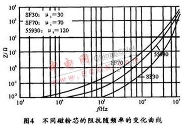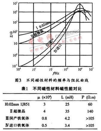 共模電感線圈如圖l中Lcl,Lc2是繞在一只磁芯上的兩組獨(dú)立的線圈,所繞圈數(shù)相同,繞向相反。這樣,當(dāng)EMI濾波器接入電路后,兩組線圈產(chǎn)生的磁通在磁芯中將相互抵消,故不會(huì)使磁芯飽和。對(duì)于干擾信號(hào)而言,共模磁芯一般工作在低磁場(chǎng)區(qū)域,所以,共模濾波電感選用的磁性材料要求具有較高的初始磁導(dǎo)率μi。如果只針對(duì)濾波器的插入損耗這一指標(biāo),則初始磁導(dǎo)率μi越高,濾波電路呈現(xiàn)的感抗就越大,所得到的插入損耗指標(biāo)就越好。但在整個(gè)電路中,還要綜合考慮磁性材料在電路中的其它特性,如頻率阻抗特性、居里溫度、磁材的形狀等等。μi值不同的各種磁性材料,在不同頻率下的阻抗特性也不一樣,故要根據(jù)所需要的頻率范圍來(lái)選取合適μi值的磁性材料。圖3所示是不同類型的高μi軟磁材料在同樣條件下的頻率與阻抗關(guān)系曲線,該曲線反映出電感磁芯的插入損耗變化趨勢(shì)。其它的性能參數(shù)(如電感值、體電阻等)如表1所列。