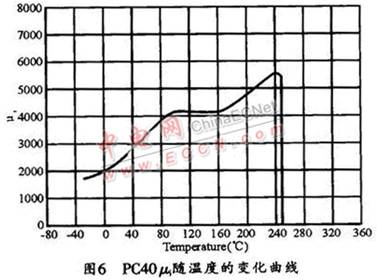 中小功率的EMI濾波器產(chǎn)品中選用最多的磁芯材料是日本TDK公司 的PC40 (它是目前業(yè)界廣泛使用的較好的材料之一),它的初始磁導(dǎo)μi隨溫度的變化曲線如圖6所示。從圖中可看出,溫度變化對(duì)μi的影響是很大的,磁芯溫度在 90~150℃的區(qū)間內(nèi),有一段平坦區(qū),這時(shí)它的μi大約在4100左右;當(dāng)溫度低于90℃后,μi值會(huì)隨著溫度的降低而逐漸減小,到0℃時(shí),μi值只有 2000左右,進(jìn)到負(fù)溫區(qū)后,μi值還會(huì)進(jìn)一步減?。欢?dāng)溫度高于150℃后,μi值則會(huì)隨著溫度的升高而增加,當(dāng)達(dá)到240℃時(shí),μ的最大值為5600 左右;從240℃開始,μi值又漸漸減小,當(dāng)溫度達(dá)到居里溫度點(diǎn)250℃時(shí),材料失去磁性。