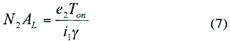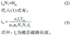 式中:e2為次級感應電壓,Ton為導通時間,N2為次級線圈匝數(shù),Ae為磁芯有效截面積,△B為工作磁感應強度,單位為特斯拉(T)。