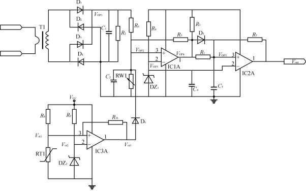 借助上述電路我們可以很容易地構(gòu)成,輸入過、欠壓保護(hù),輸出過、欠壓保護(hù),以及過熱保護(hù)。在此僅以附加過熱保護(hù)為例,說明如下:如圖1所示,過熱保護(hù)線路是由IC3A及其周邊元件組成。當(dāng)電源的溫度沒有超過設(shè)定溫度時,Vot1<Vot2,運(yùn)放IC3A的輸出電壓Vot3為低電平,由于有二極管D6的存在,此時IC3A的輸出電壓Vot3不會影響到VOP2的電壓,也就是說在過熱保護(hù)線路未起作用時,它不會影響到上述的過流保護(hù)線路的性能。當(dāng)電源的溫度超溫時Vot1>Vot2,運(yùn)放IC3A的輸出電壓Vot3變?yōu)楦唠娖?,通過二極管D6,使VOP2的電壓升高,從而觸發(fā)過流保護(hù)線路使電源進(jìn)入停止工作期。只有當(dāng)電源溫度降低到超溫保護(hù)點(diǎn)以下時,電源才能重新進(jìn)入正常工作狀態(tài)。依此類推可以構(gòu)成其它輸入輸出過、欠壓保護(hù)線路。在此不再贅述。
