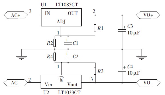 LT1083/LT1033 系列正負(fù)可調(diào)穩(wěn)壓器的效率大大高于現(xiàn)有器件,可以提供7.5 A、5 A 和3 A 輸出電流,并能在低至1 V 的壓差條件下運(yùn)行,壓降在最大電流條件下保證在1.5 V 以內(nèi)。負(fù)載電流減小時(shí)允許壓差同時(shí)減小,可在多種電流水平條件下通過片內(nèi)修整電路,提供所保證的最小壓差,并能夠使輸出電壓準(zhǔn)確度調(diào)節(jié)至1%.其電壓調(diào)整率為0.015%,負(fù)載調(diào)整率為0.01%,對(duì)電流限值也進(jìn)行了修整,最大限度地減小了過載條件下穩(wěn)壓器和電源電路上承受的應(yīng)力,具有熱功耗限制保護(hù)[10].LT1083/LT1033 系列器件的引腳與老式三端穩(wěn)壓器兼容,與大多數(shù)穩(wěn)壓器設(shè)計(jì)中的10 μF 輸出電容器以及PNP 穩(wěn)壓器多達(dá)10%的輸出電流作為靜態(tài)電流消耗不同,LT1083/LT1033 系列的靜態(tài)電流流入負(fù)載, 大大降低了電源功耗。此芯片電壓調(diào)整率小、負(fù)載調(diào)整率小的特點(diǎn)能夠保證輸出電壓穩(wěn)定度高。正負(fù)線性穩(wěn)壓模塊電路如圖3 所示,其中R1=R3,R2=R4.電路中的電阻參數(shù)可根據(jù)輸出可調(diào)電壓公式確定: