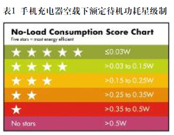 這些關(guān)注的結(jié)果是采取一系列措施來提升效率和降低空載功耗的需求。其中最新最嚴(yán)格的是由全球前五大手機(jī)廠商提出的一項(xiàng)自愿性的充電器星級(jí)制協(xié)定,用以標(biāo)志在充電完成之后,充電器仍插在壁式插座上時(shí)的耗能量。該星級(jí)制從0星級(jí)開始,最高5星級(jí)??蛰d下額定待機(jī)功耗大于0.5W的充電器為0星級(jí)標(biāo)簽,待機(jī)功耗小于0.03W(30mW)的為5星級(jí)(見表1)。通過比較,大多數(shù)現(xiàn)有手機(jī)的待機(jī)功耗在150~300mW范圍。