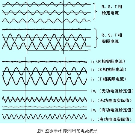 如果由于線路缺相,CT也檢測不到電流(例如r相電流ir=0),則由于平衡控制會使另外兩相電流的相位差變?yōu)?80°,幅值相等(當(dāng)然為補(bǔ)償“缺相”的那相電流,另兩相電流將增大),以滿足矢量和為零的控制要求,如圖8所示。此時,根據(jù)r、s、t相實(shí)際電流計(jì)算出的有功分量電流iq和無功分量電流id已經(jīng)不是正常直流量,而是含有2倍頻(相電流頻率)成份的交流量,參見圖8,整流器無法正常工作。